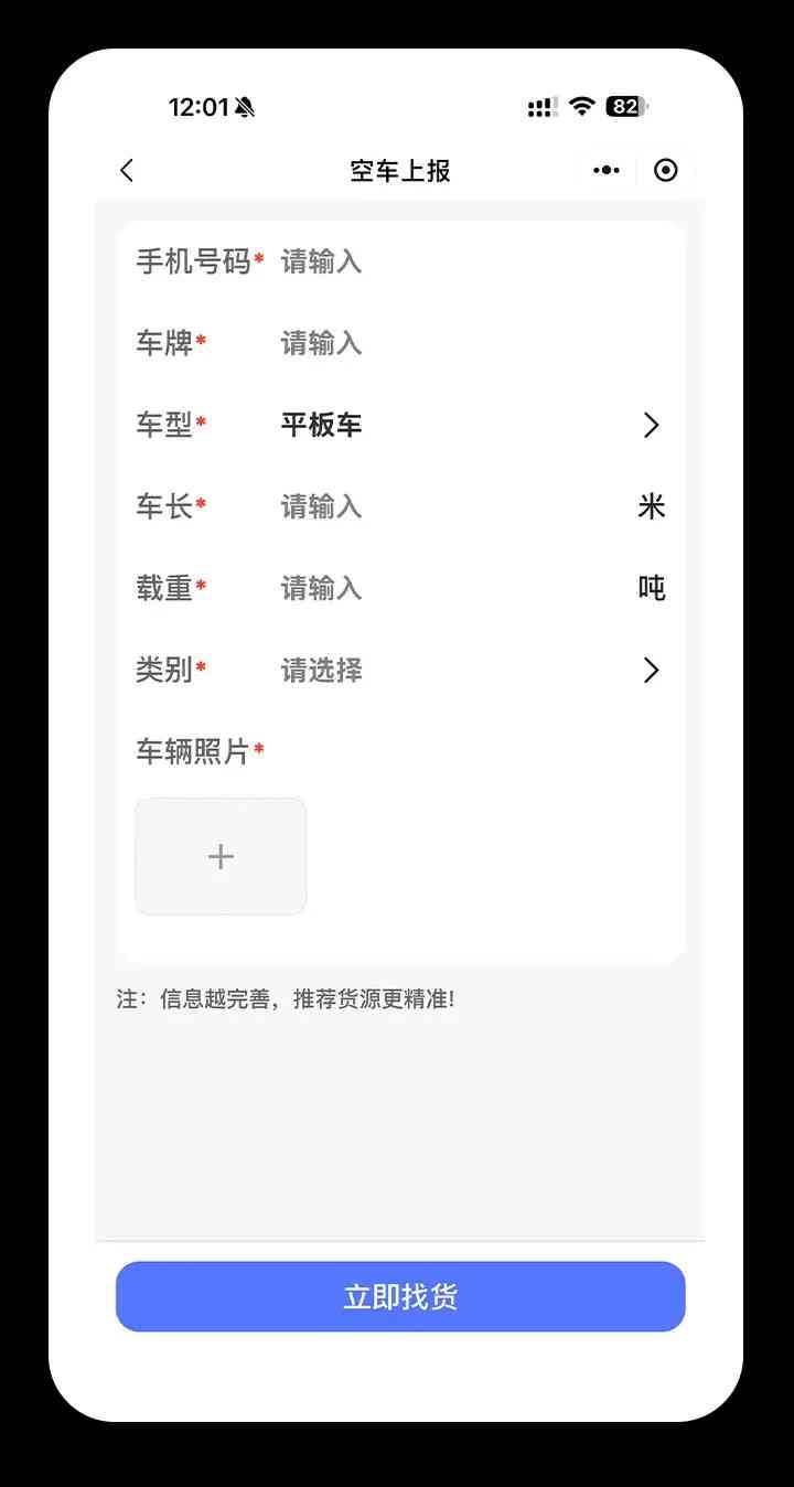 2.填写车辆信息:车型、吨位、槽罐类型等(首次填写后系统会记住)