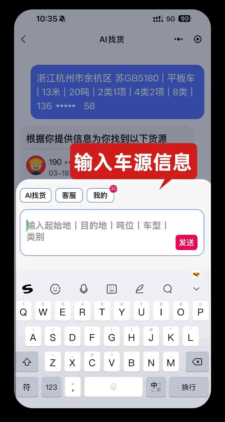 如果你想找不同的类别的货源,只需在底部输入框直接输入:车型、吨位、目的地、出发地,发送后AI会立即为你推送新的适配货源。
