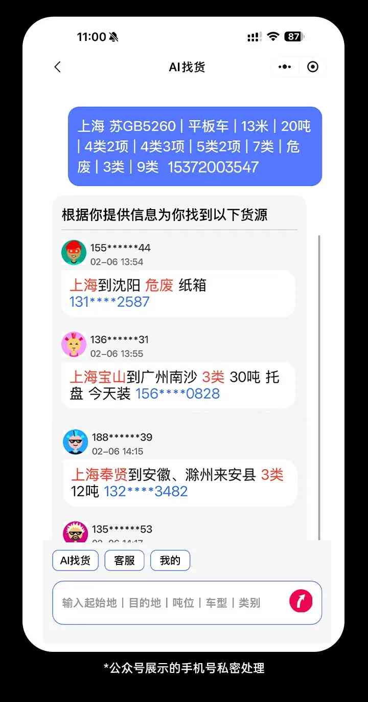 如果你想找不同的类别的货源,只需在底部输入框直接输入:车型、吨位、目的地、出发地,发送后AI会立即为你推送新的适配货源。