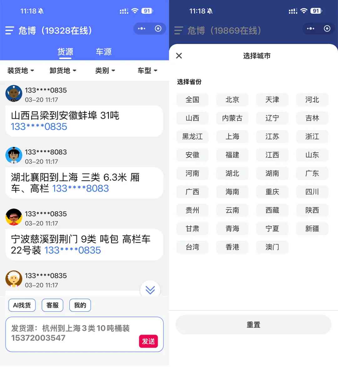 不用爬社群,信息集中、一键筛选货源/车源,按路线、车型、时间等条件过滤、点击电话直接拨打,价格自己跟货主车主联系、危博不介入交易,直接对接。