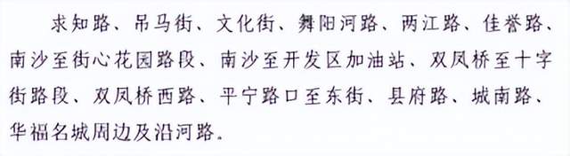 全天24小时禁止通行求知路、吊马街、文化街舞阳河路、两江路、佳誉路、南沙至街心花园路段、南沙至开发区加油站、双凤桥至十字街路段、双凤桥西路、平宁路口至东街、县府路、城南路、华府名城周边及沿河路。